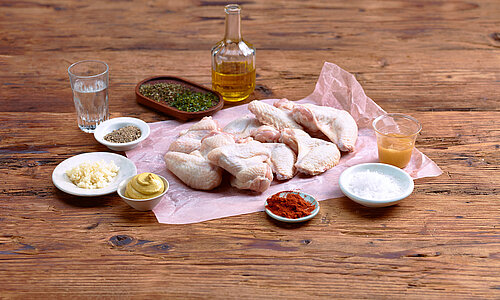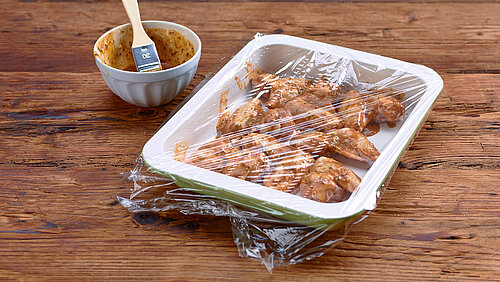 Couvre les ailes de poulet marinées et laisse-les reposer au frigo pendant env. 12 heures. Mets aussi le reste de la marinade au frigo.