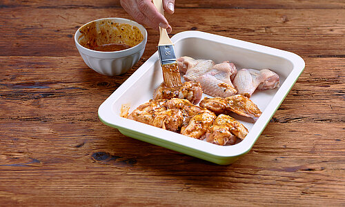 Avant de badigeonner les ailes de poulet de marinade, rince-les bien sous l’eau froide et sèche-les avec du papier ménage.