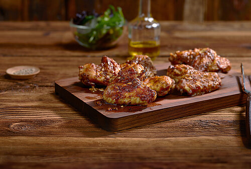 Fais préchauffer le four, à 160° C pour les fours à chaleur tournante ou à 180° C pour les fours à chaleur supérieure et inférieure. Sale les ailes de poulet, mets-les dans un plat à four et place-le au milieu du four. Badigeonne régulièrement les ailes avec un peu de marinade. Attention: laisse toujours cuire une marinade pendant un bon moment.