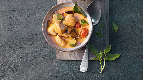 Pendent ce temps, parer les mini-courgettes et les couper en rondelles. Égrapper les tomates-cerises et les laver. Mettre les courgettes, les tomates, le sucre de palme et les feuilles de limettier dans le curry, assaisonner soigneusement de sauce de poisson et laisser mijoter encore 4-5 minutes.3