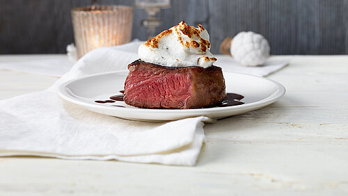Sortir les entrecôtes du four, les couper en deux, les servir sur des assiettes préchauffées et saler légèrement. Ajouter par-dessus la préparation de meringue et la faire légèrement caraméliser à l’aide d’un brûleur pour crème brûlée. Répartir la sauce au cacao autour de la viande et servir immédiatement.