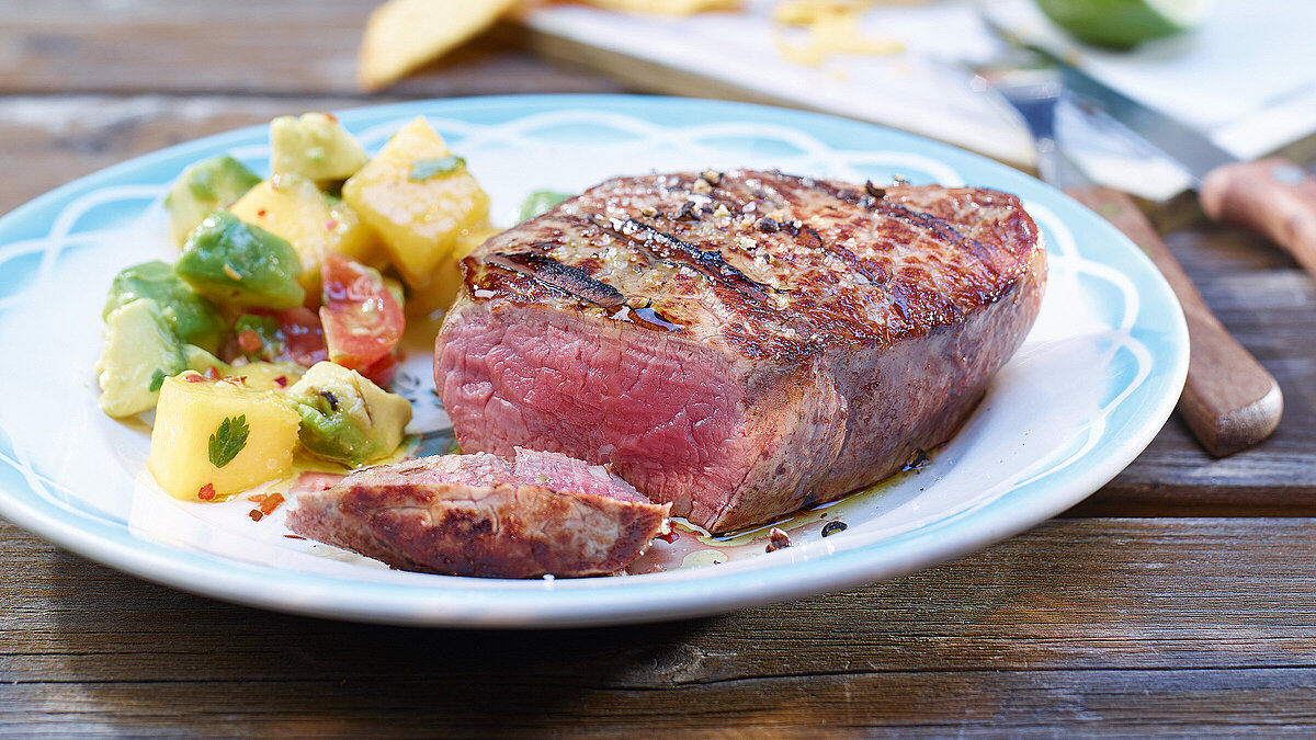 Saler et poivrer la viande selon son goût et servir avec la salade de mangue et d’avocat.