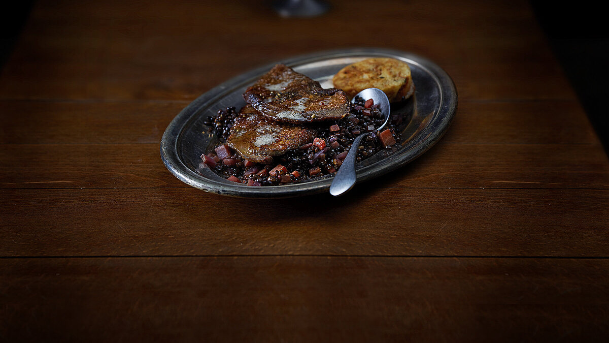 Peler l’oignon, le céleri et les carottes, puis les couper en tout petits dés. Faire chauffer un deuxième tiers de beurre et y faire revenir les dés de légumes pendant 3-4 minutes à feu doux. Ajouter les lentilles et verser le bouillon. Ajouter le clou de girofle, le piment et le thym, couvrir et laisser mijoter 20-25 minutes en ajoutant éventuellement du liquide. Assaisonner les lentilles cuites avec du sel, du poivre et du vinaigre balsamique, et réserver.3