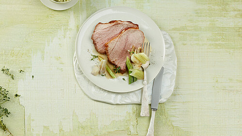Assaisonner l’épaule de veau avec du sel, du poivre et le thym-citron. Déposer la viande dans une cocotte avec les gousses d’ail puis mettre au four préchauffé à 180° C chaleur inférieure et supérieure (160° C four à air chaud). Laisser cuire env. 30 minutes. Parer les oignons de printemps et le céleri puis les couper grossièrement en morceaux. Déglacer le rôti avec le vin blanc et ajouter les légumes préparés. Laisser cuire encore 30-45 minutes à la même température. Ajouter éventuellement un peu d’eau.2