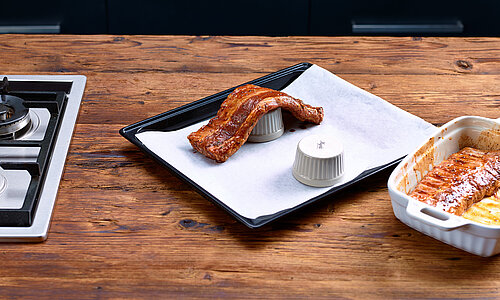 Fais préchauffer le four à 160° C pour les fours à chaleur tournante ou à 180° C pour les fours à chaleur supérieure et inférieure. Recouvre la plaque du four de papier sulfurisé et pose deux petits ramequins allant au four dessus. Sors les spare-ribs du frigo, laisse la marinade s’égoutter un peu et pose tes spare-ribs sur les ramequins. Sale les spare-ribs et mets-les dans un plat au milieu du four.