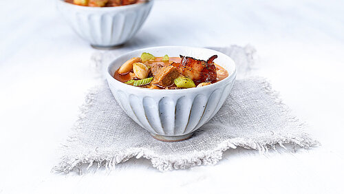 Rüebli und Lauch rüsten und fein schneiden. Zwiebel schälen, halbieren und in Streifen schneiden. Öl in einem grossen Topf bei mittlerer Stufe erhitzen, Gemüse und Zwiebeln darin glasig dünsten. Tomatenpüree dazugeben und 4–5 Minuten unter Rühren rösten. Siedfleisch und Markknochen hineingeben, mit ca. 2 l Wasser auffüllen, sodass alles gut bedeckt ist, und langsam zum Kochen bringen.
