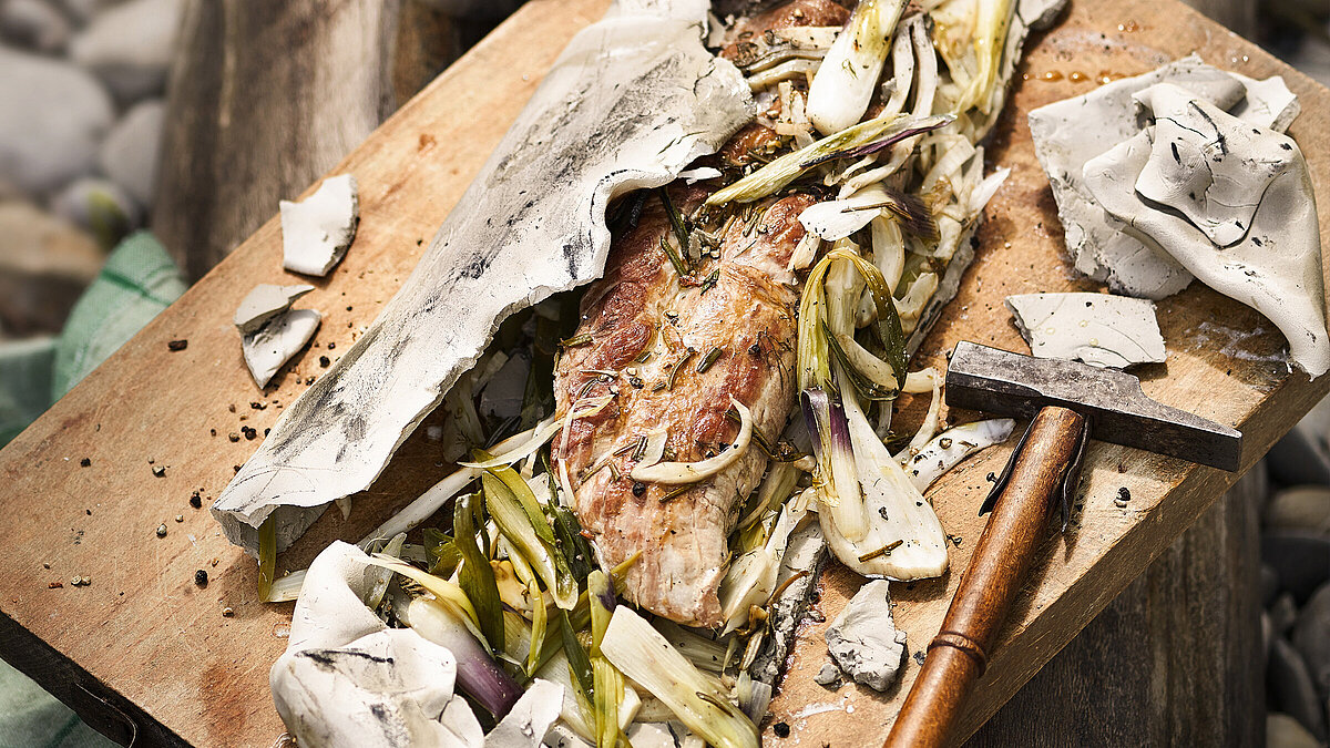 Tonpäckchen direkt in die heisse Glut geben und ca. 25–30 Minuten garen. Mit einer Grillzange herausheben, auf eine feste Unterlage legen und den Tonmantel mit einem Hammer zerschlagen. Filet und Gemüse herauslösen, mit Salz, Pfeffer und etwas Zitronensaft würzen.