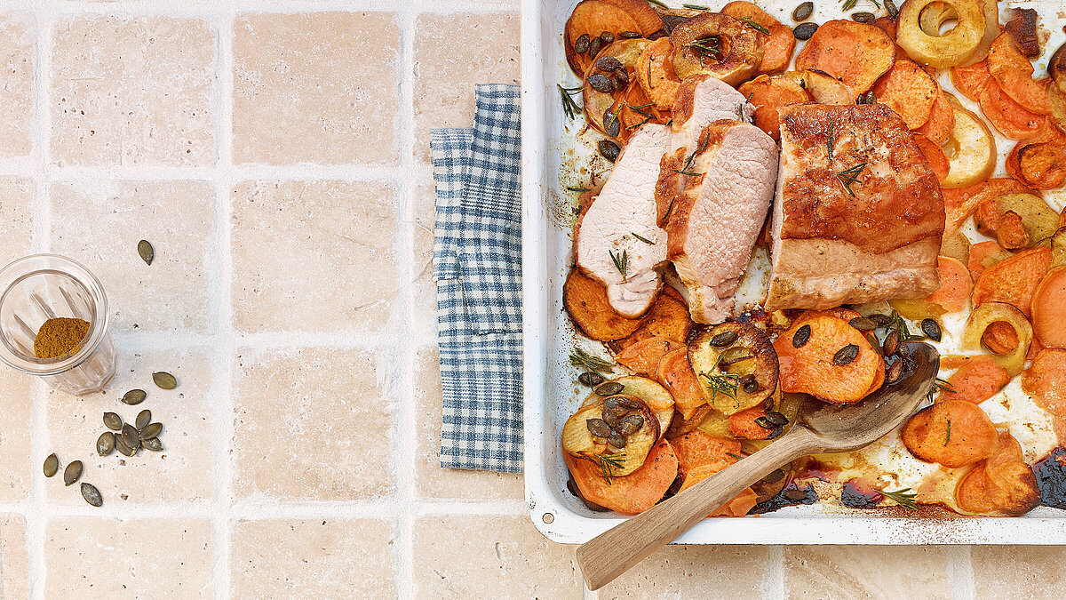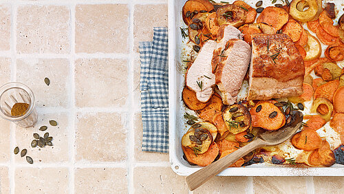 Gemüsemischung auf dem Backblech um den Braten verteilen. Rosmarinnadeln abzupfen und darübergeben. Das Ganze im vorgeheizten Ofen 45–50 Minuten bei 180 °C Ober-/Unterhitze garen. 15 Minuten vor Ende der Garzeit die Kürbiskerne darüberstreuen.